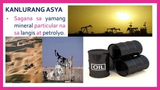 -KALAKALAN SA TIMOG AT KANLURANG ASYA LAYUNIN. Kahit saang parte ng Asya ay makikita na mayaman ito sa langis dahil dito rin kumukuha ang mga malalaking bansa tulad ng US at China. Langis at petrolyo B.