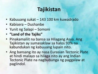 Ang Tajikistan ay isang mabundok na bansa. Ayon sa mga arkeologo silay naninirahan sa Tajikistan simula pa ng huling bahagi ng panahon ng paleolitiko. Tajik Ng Hilagang Asya is on Facebook.