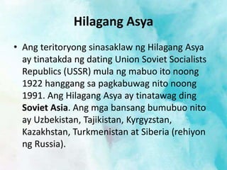 LIKAS NA YAMAN SA SILANGAN ASYA SalagosteGlenn Vincent grade 7 Filipino PBA2AP PBA 1 LIKAS NA YAMAN NG HILAGANG ASYA ANG TSINA ANG NANGUNGUNA SA PRODUKSIYON NG PALAY SA BUONG MUNDO PANGUNAHING LIKAS NA YAMAN LUPA Mga Bansa sa Silangang Asya. Ayon sa mga arkeologo sila ay naninirahan sa Tajikistan simula. Contextual translation of timog hilagang asya tagalog into English.
